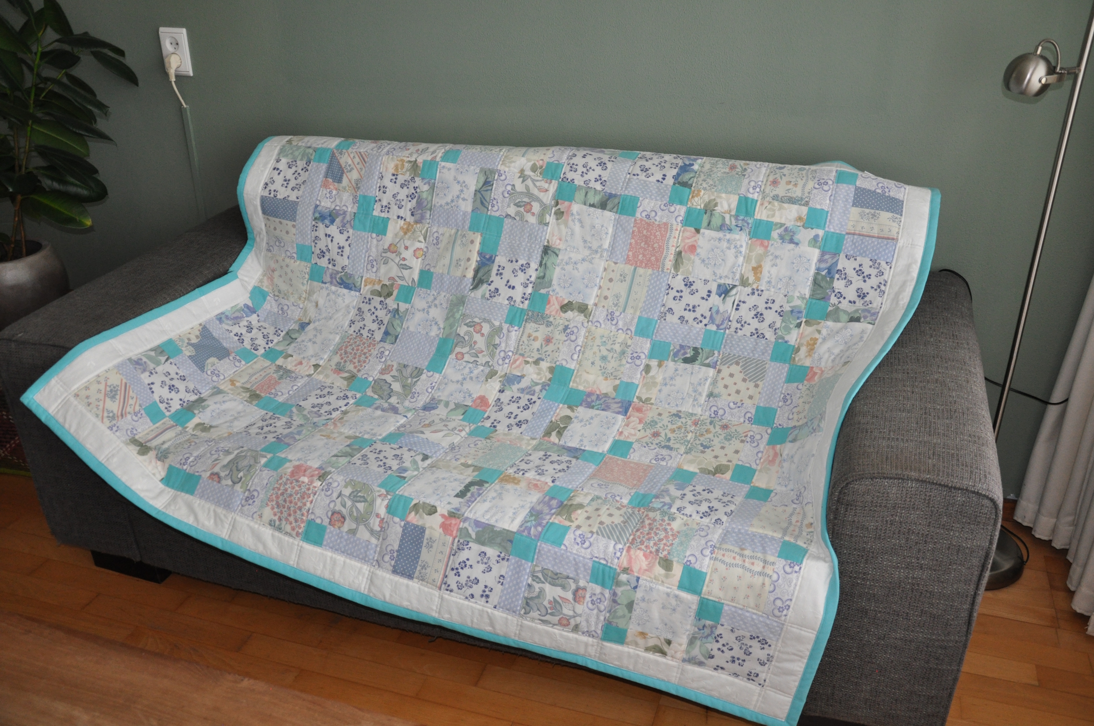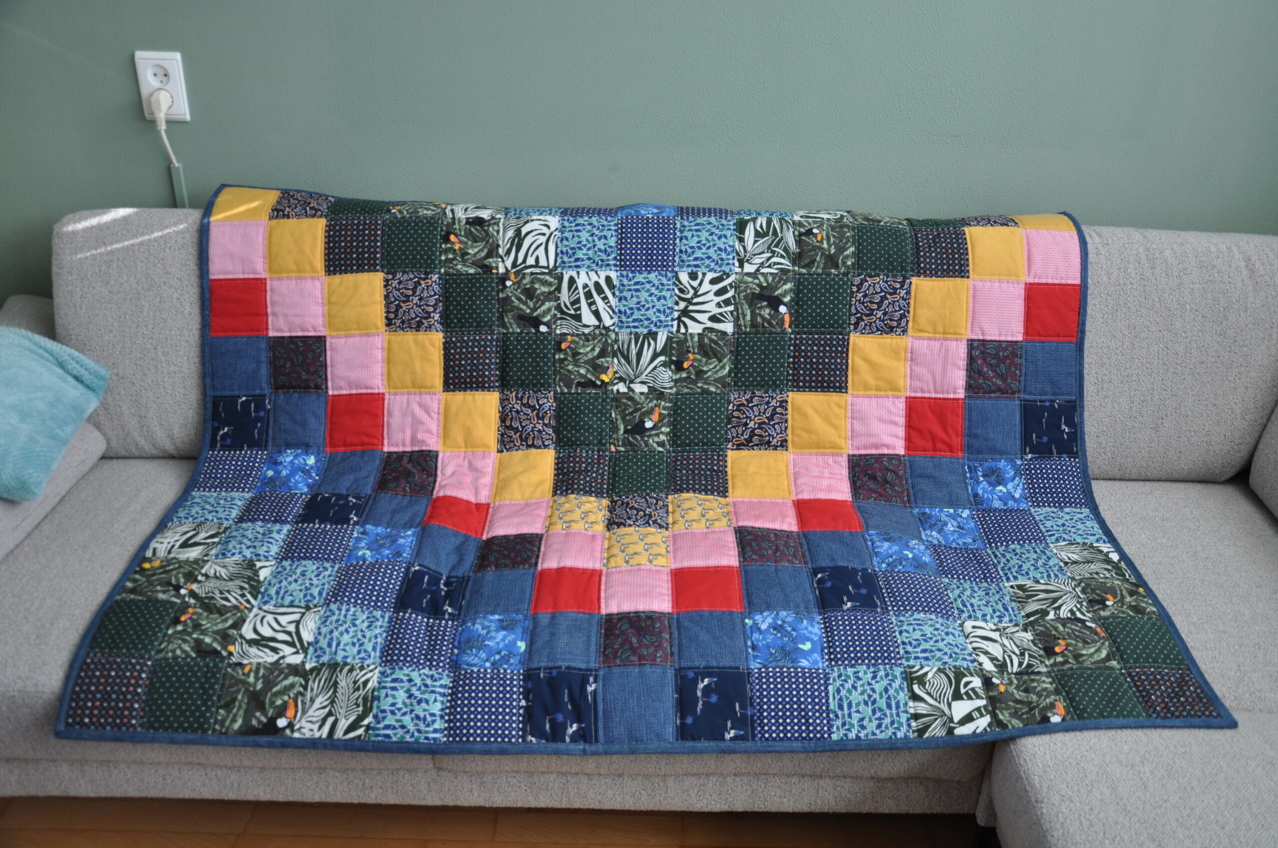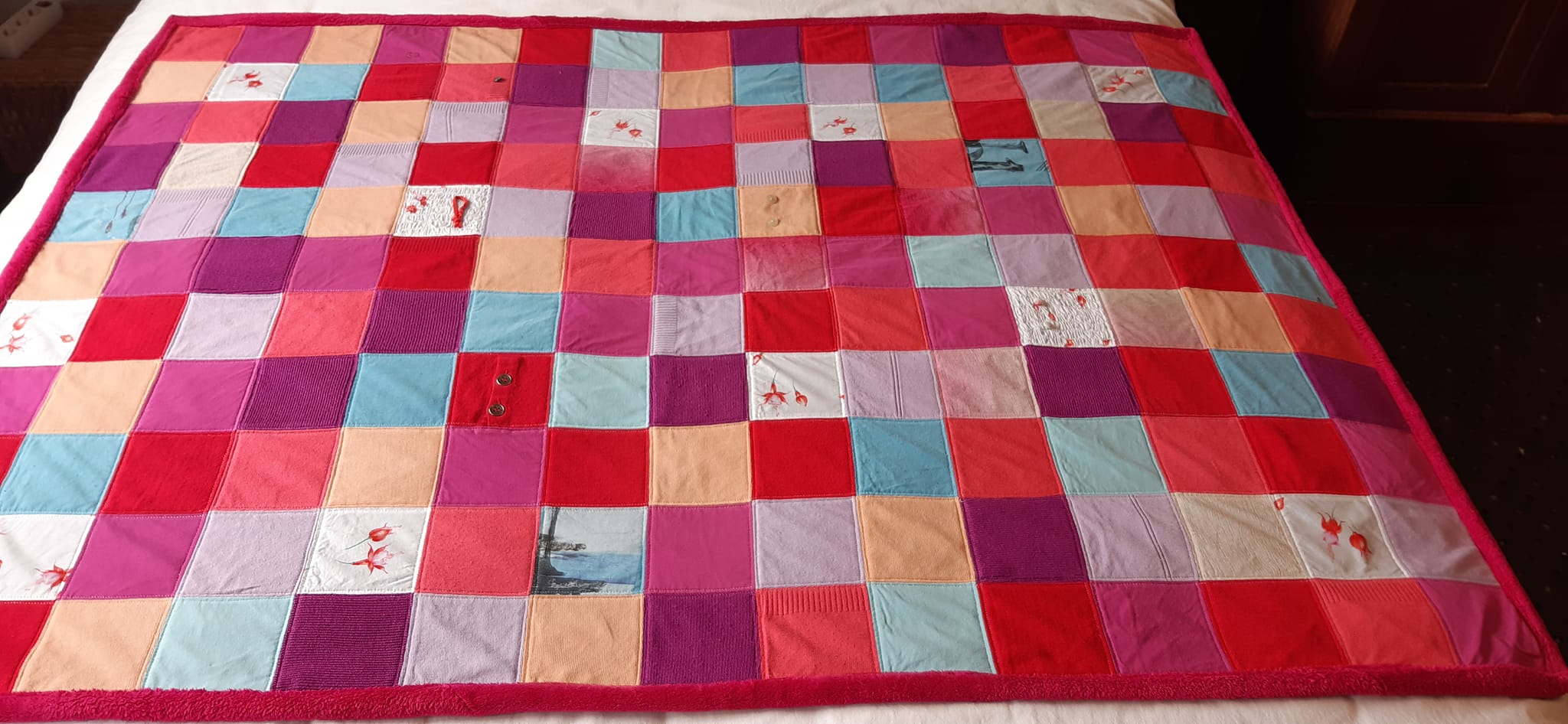 Meestal maak ik vierkante lapjes die ik (eventueel met een zachte tussenvoering) tot een deken maak. De achterkant van de deken kan gemaakt worden van bijvoorbeeld een oud dekbedovertrek of fleecedekentje die je zelf aanlevert of we zoeken samen een mooie kleur flanel of fleece uit die bij de deken past. Dat is lekker zacht en warm.