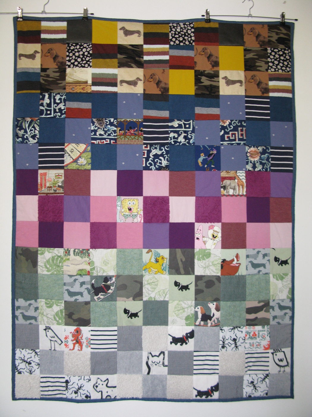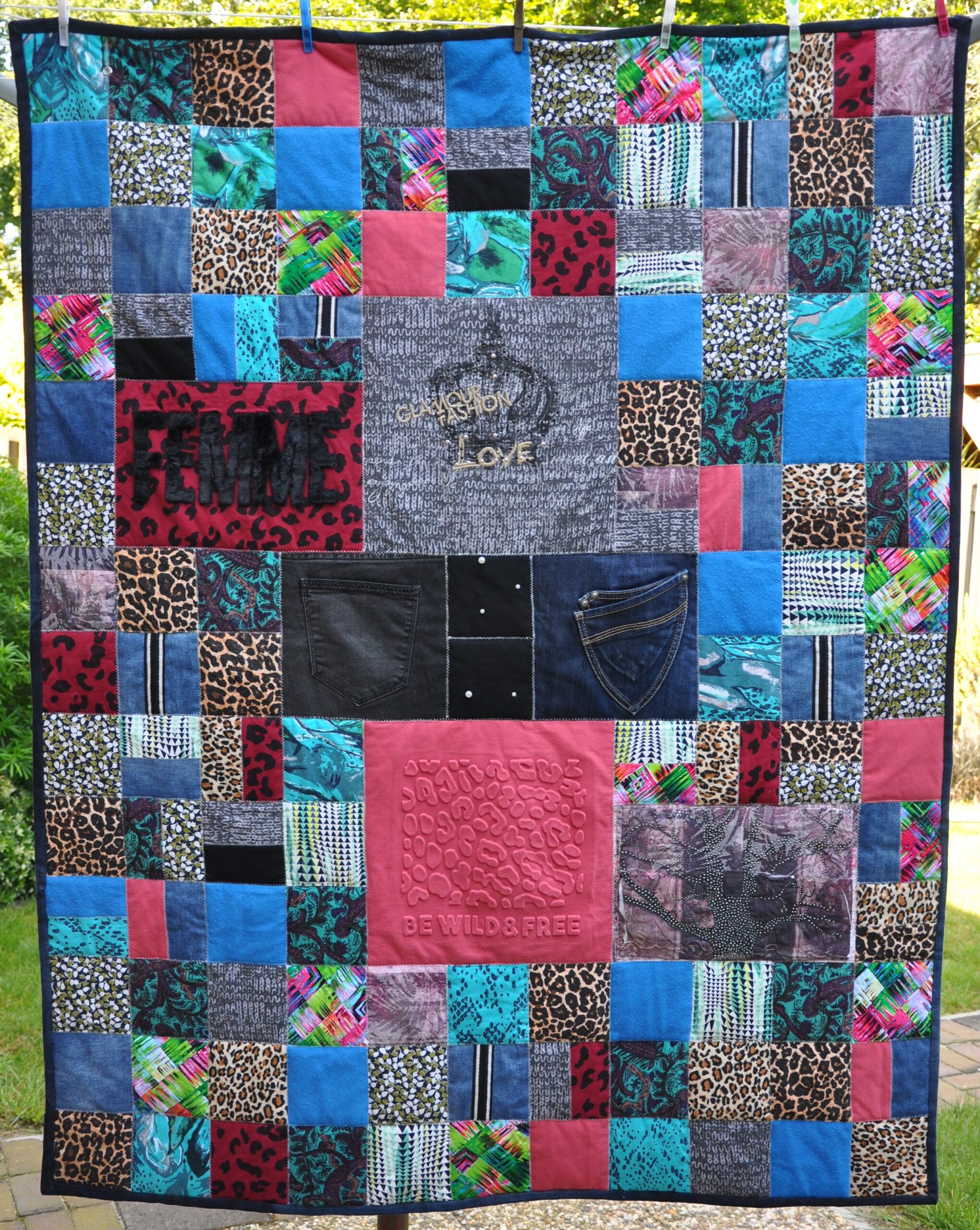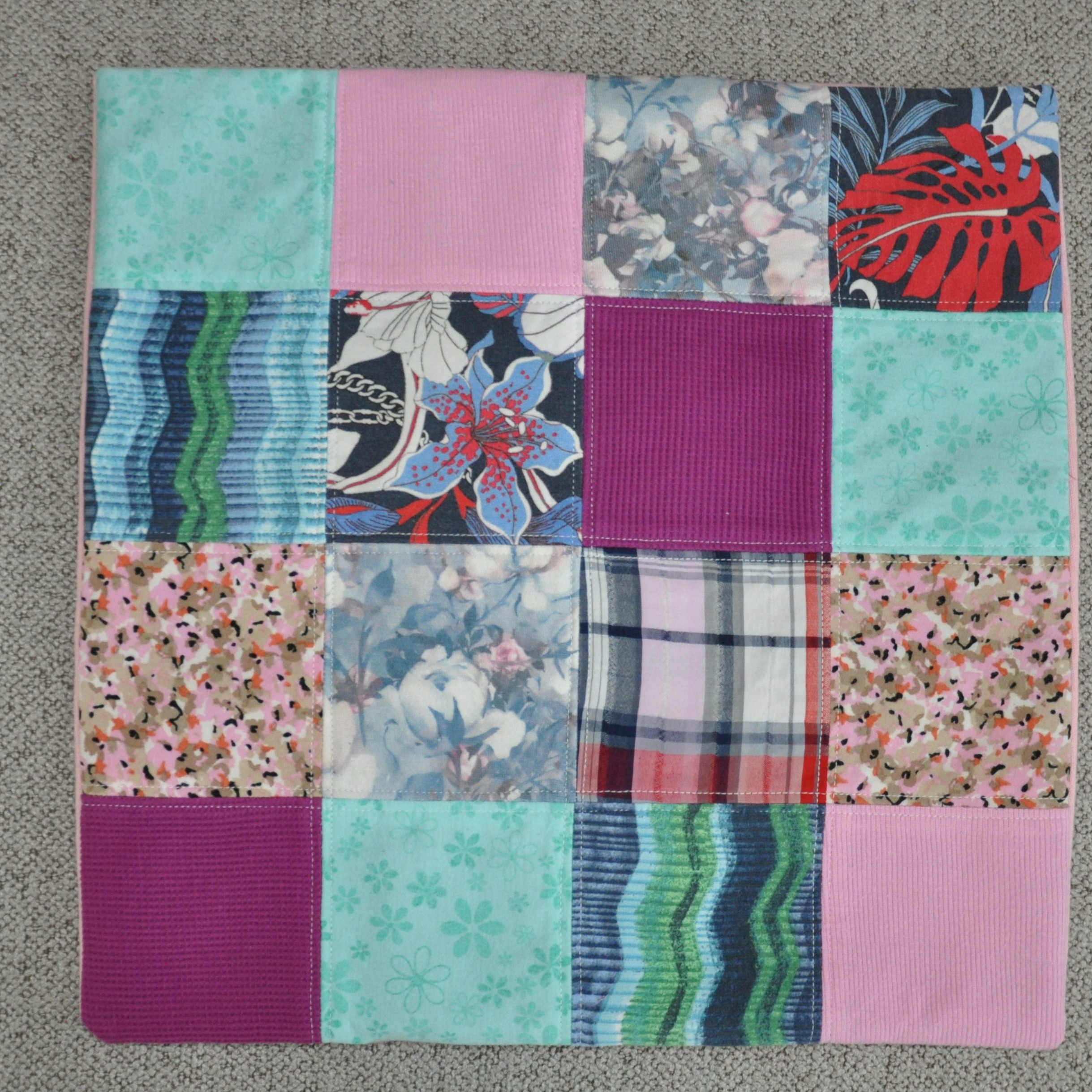 Meestal maak ik vierkante lapjes die ik (eventueel met een zachte tussenvoering) tot een deken maak. De achterkant van de deken kan gemaakt worden van bijvoorbeeld een oud dekbedovertrek of fleecedekentje die je zelf aanlevert of we zoeken samen een mooie kleur flanel of fleece uit die bij de deken past. Dat is lekker zacht en warm.