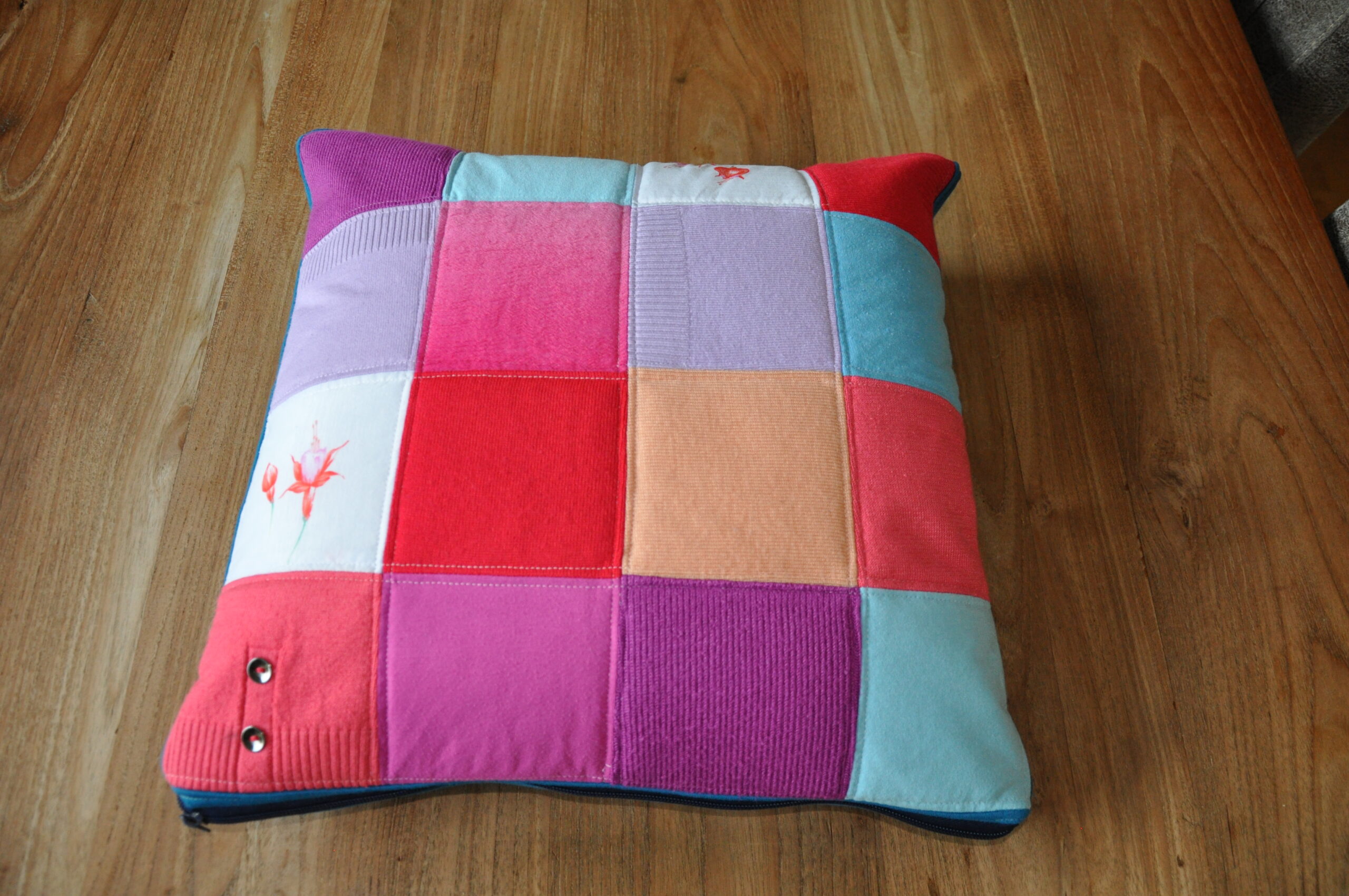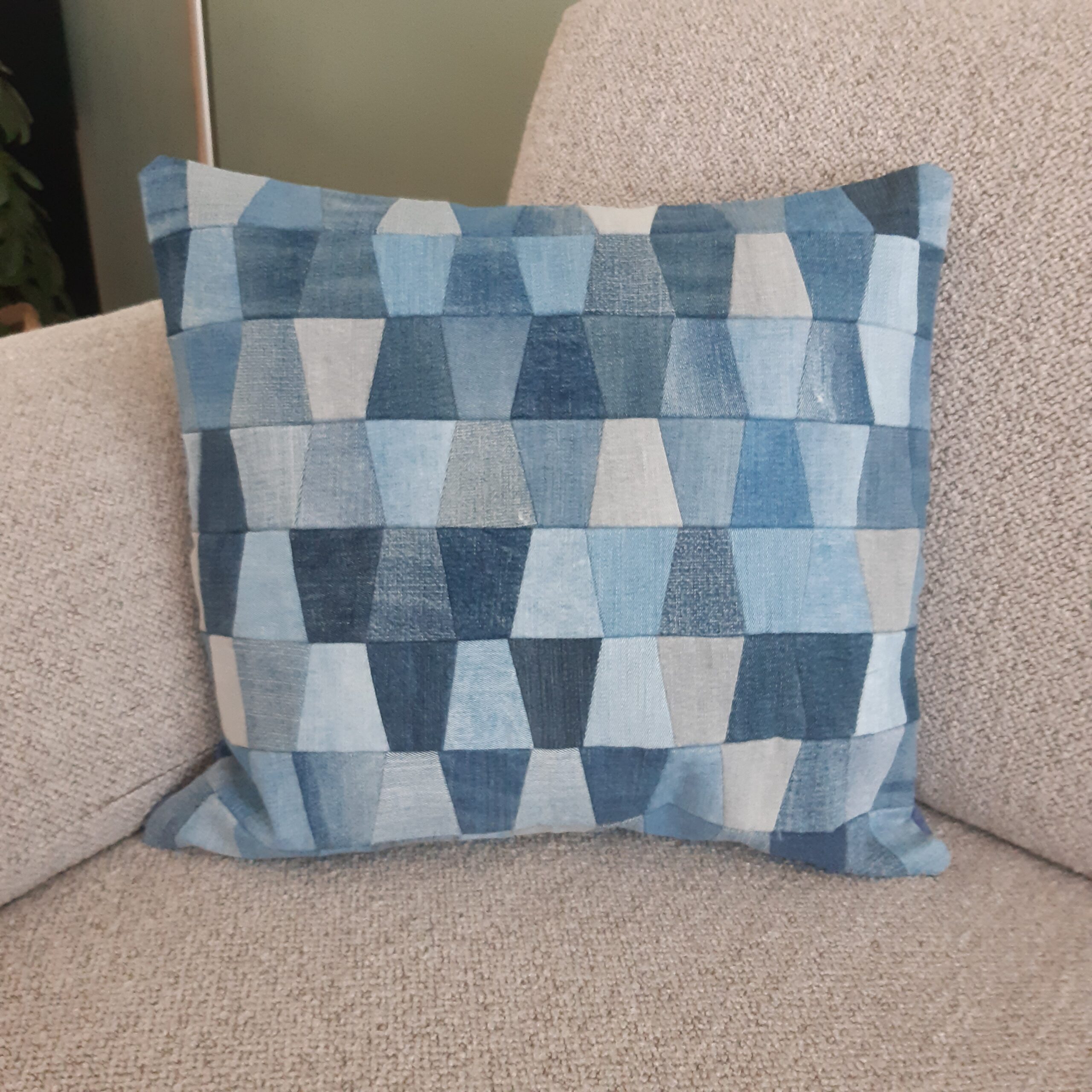 Van kleding kan ik een kussenhoes maken voor een kussen dat je al hebt, of voor een nieuw binnenkussen.