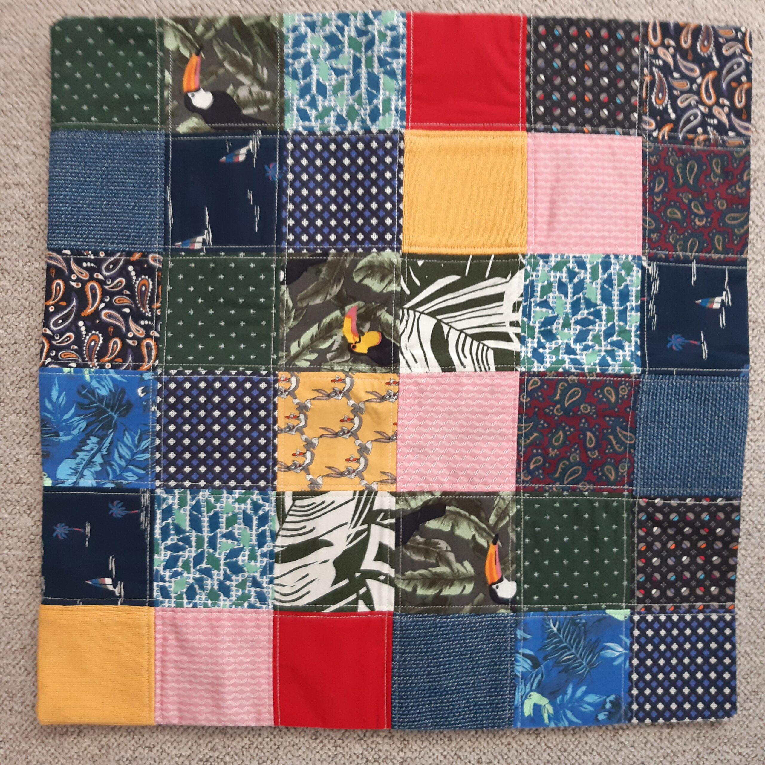 Voor een kussen van 40×40 cm heb ik ongeveer 16 lapjes van 12 x 12 cm nodig. Plus een lap stof voor de achterkant en de afwerking aan de binnenkant. Ook kan ik eventueel kleding gebruiken voor de achterkant, bijvoorbeeld een mooi overhemd waarvan de knoopjes dan ook de sluiting van het kussensloop worden. Of een mooie trui.