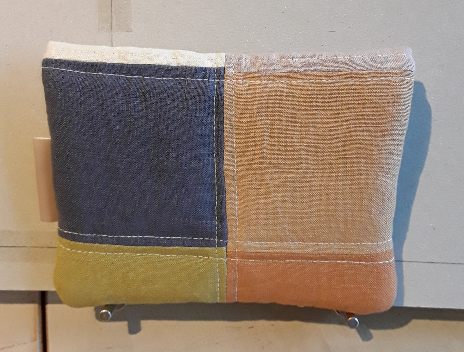 Klein opbergtasje gemaakt van stof van een gordijnstaal, gevoerd met fiberfill voor een zachte bescherming. Sluit via een drukkertje. Ideaal om je oortjes of telefoon lader in op te bergen.