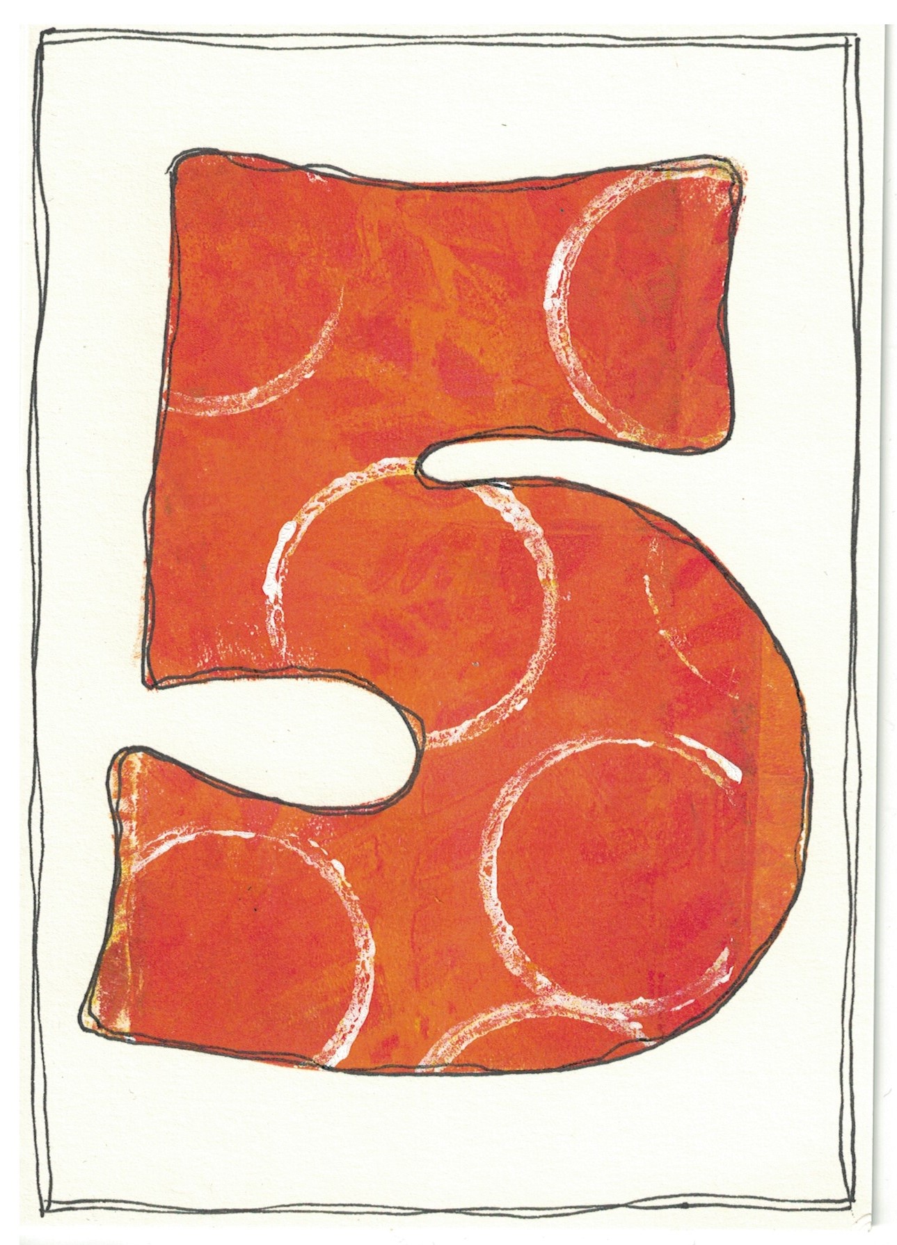- Acrylverf, direct op de kaart gedrukt. Afgewerkt met fineliner.